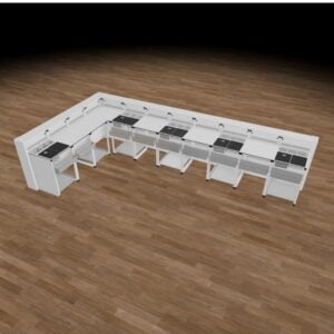 This 16 Ft x 4 Ft L-shape bar rental is prepared for beverage service. Up to four staff can use this workstation to prepare and serve beverages.
